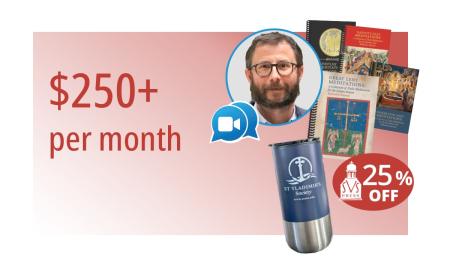 As a heartfelt thank you for your support as a new member of the St. Vladimir’s Society, we are pleased to offer gifts corresponding to different levels of monthly giving. These gifts include such items as a St. Vladimir’s Society magnet; a one-time coupon for SVS Press; a prayer rope with thirty-three knots and a silver-tone cross; four meditation booklets for the fasting periods (Great Lent, Apostles’ Fast, Dormition, and Nativity); a St. Vladimir’s Society tumbler; an invitation to a virtual meeting with St. Vladimir’s Orthodox Theological Seminary Dean Dr. Ionuț-Alexandru Tudorie; and a St. Vladimir icon blessed by a seminarian priest.